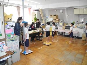 保健室に入ると、間隔をとって並んで、体重、身長の順に測りました。