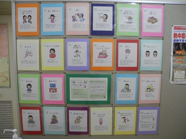 保健室前の廊下に、「気持ちを楽にする23のくふう」という掲示がありました。