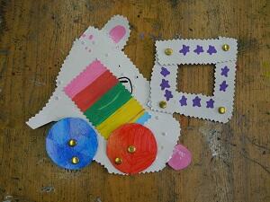「ふしぎなのりもの」と題して、まず各自が厚紙で「のりもの(生き物もあり)」を作り、それが旅をしていくという想定で物語を作っていたようです。