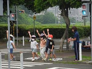 歩行者チームは、横断歩道での注意を、実施練習です。