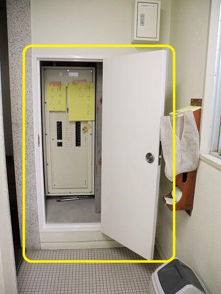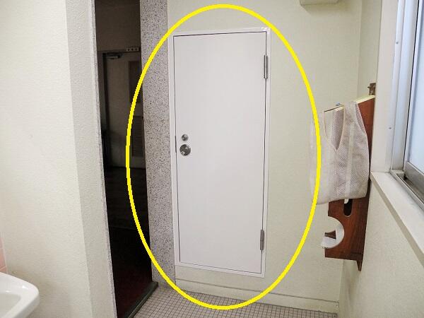 1Fの図工室前トイレを明るくしようと、ペイントや装飾を計画して進行中なのですが、トイレ内にある電源盤の鉄製の扉のペイントに思案していたところでした。