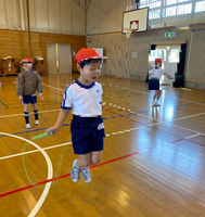 1年生の体育では縄跳びに取り組んでいます。縄跳びカードが合格できるように毎時間練習に励んでいます。一度跳ぶことができるとコツを掴み、何度も跳べることができるように家でも練習しています。