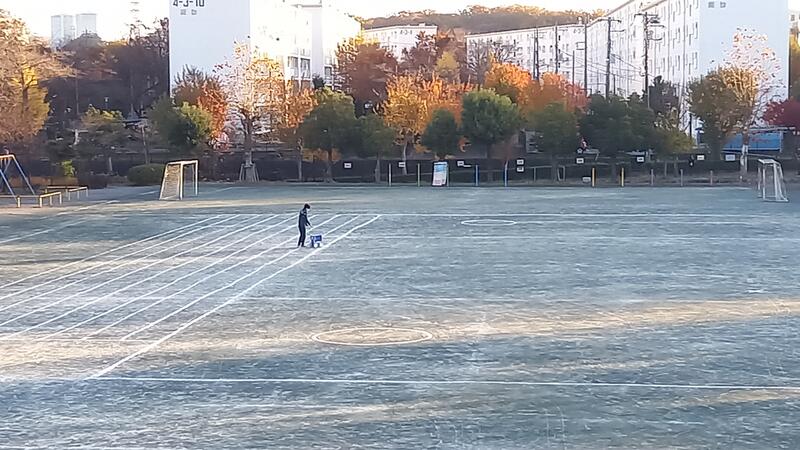 朝日がのぼってしばらくした頃、グラウンドでは本校教員が体育科学習の準備をしていました。「子供たちの学習が一層主体的に進められますように」と思いながらの「見えない」取組です。