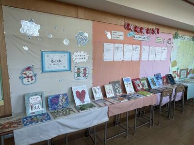 図書室前の廊下の様子です。冬の本を集めて紹介したり、委員会児童によるクイズを載せたり、たくさんの本を読んだみなさんを紹介する読書の木などがあります。