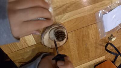 短い時間でしたが、木工クラフトに取り組みました。間伐材を使った作品づくりとなりました。基本はバッチでしたが、置物などの立体に挑戦する子もいました。