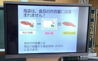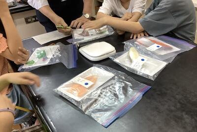 東京計量士会の方々が出前計量教室を行ってくださいました。場所は理科室で、各グループに分かれて、魚の切り身のレプリカを使って「売っている食料品の重さ調べ」を行いました。売っている食料品にはたいていの場合、風袋というものが付随しており、表示の量が異なることや、どの商品も正確に計量されていることを子供たちは体験しながら、実感していました。