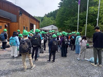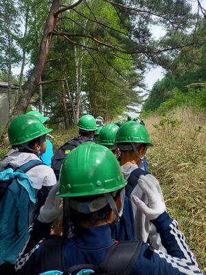 玄関に集合しました。集合写真撮影後に森林に入っていきます。