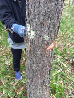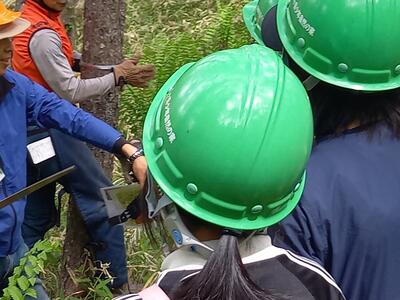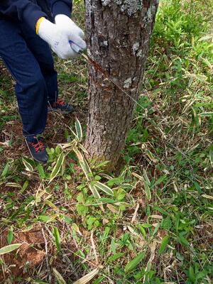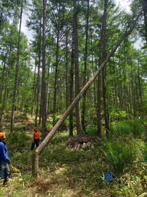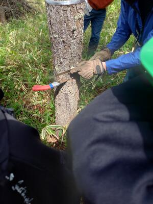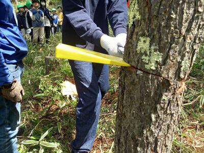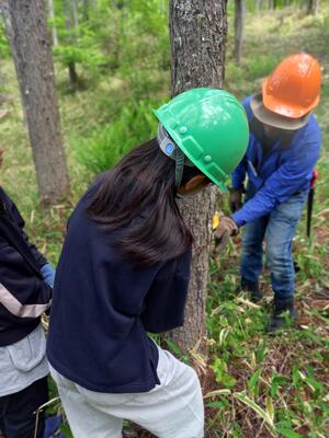 実際に間伐が始まりました。ノコギリの角度などに注意を払わなければなりません。