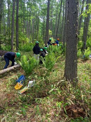 いよいよ体験が始まります。今日は「間伐体験」です。人工林が密集しているところから、育ちが比較的よくないものを選びます。