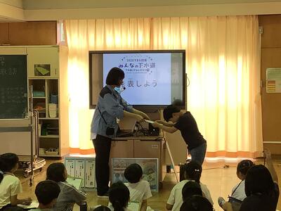 最後の感想では、「下水ますにゴミを捨てない。」、「トイレにティッシュなど分解しにくい物を流さないようにする。」んどの意見が出ました。下水道局の方から、記念品としてクリアファイルもいただきました。夏休み、今回紹介された場所に出かけてさらに研究を深めてみるのもいいですね。