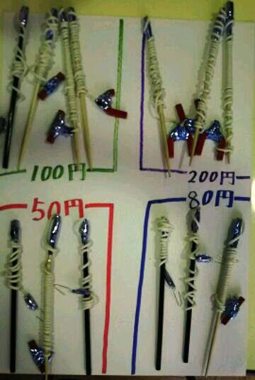 | 【なかよし1組】 自分たちで釣った魚などを買い取ってもらう活動を通して,実生活で生かせる足し算や引き算を体感します。 また,釣りに必要な釣り竿(右写真)を買う際には,同じ釣り竿でも値段が違うこともあることを知り、どちらを買えば得なのかといった視点も学びます。 | |