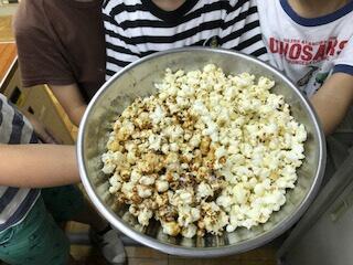 何度かの失敗?を経て、なんと、市販のものよりはるかにおいしい諏訪小ポップコーンができあがりました。塩味とキャラメル味、どちらもあとを引くおいしさでした。