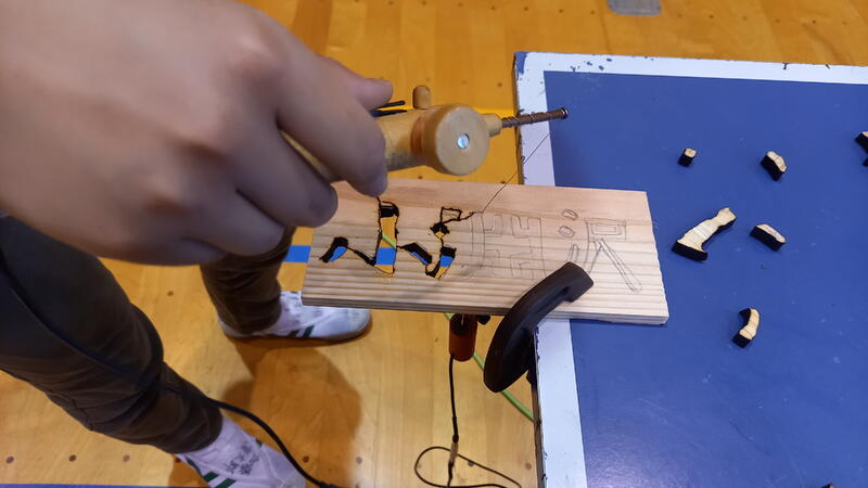薄い板材に絵や文字でデザインし、これを電熱線で切ったりくり抜いたりしながら表札やメッセージボードに仕上げていきます。手を細かく動かしながら粘り強く取り組んでいます。