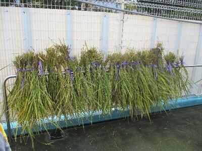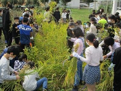 10月27日(木)、農家の相澤さんの指導の下、4月から大切に育ててきた諏訪米を収穫しました。鎌で稲穂の根元を切り、4束を合わせて紐で縛り、10日ほど乾燥させます。先週まで順調に実らせていた諏訪米ですが、かなりの数を動物らしきものに穂ごと食べられてしまいました。ショックですが、収穫できた分をみんなで味わいたいと思っています。