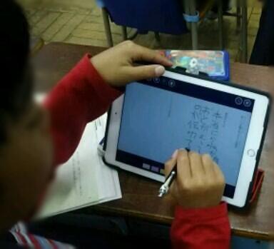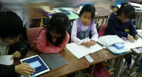 ↙↘一人が一台タブレットを使用し,自分の考えをタッチペンを使って書き込んでいきます。