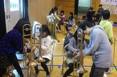 本年度部員の4~6年生が,来年度入部希望の現3年生に楽器の魅力や演奏方法を伝えました。