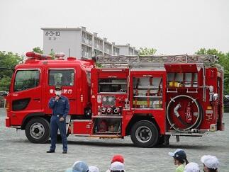 「こんなに近くで消防車を見たのは初めてだ。」と嬉しそうな声が聞こえたり、はしごの高さや扉の数などについて質問をしたりしながら、消防車と消防士の方に関心をもって取り組んでいました。