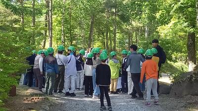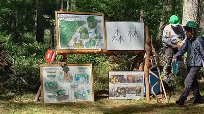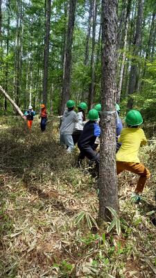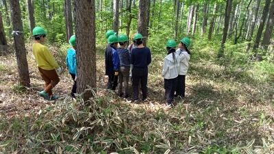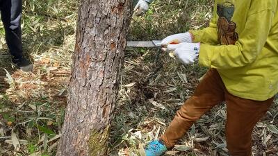 続きます。今年はまだ間伐が進んでおらず、木が密集している状態だそうです。地面に倒れてくるはずの木は途中で別の木に引っ掛かった状態になりました。チェーンソーも登場しながら、木に引っ掛けたロープを子供たちが引っ張り、何とか倒すことができました。
