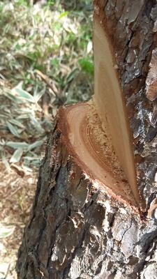 倒す方向に「受け口」という切り口を作ります。真横に木の太さの4分の1程度の切り込みを入れ、次に斜めに切れ込みを入れ、一部を抜くようにします。説明が悪くてすみません。画像を御覧ください。
