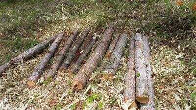 間伐した木はおよそ160cmに切りました。これを後に運び出すことになるそうです。数名一グループになり、交代交代で切り進めました。