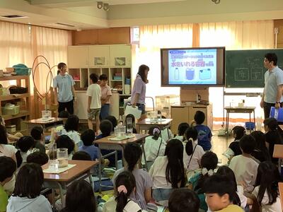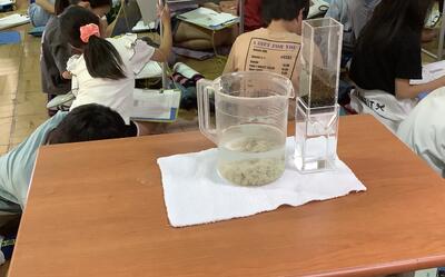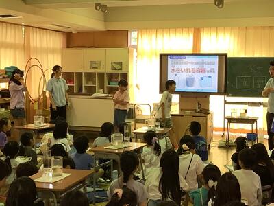 今日は、水道キャラバンの方々が学校に来て水の大切さについて体験も交えながら話をしてくださいました。濁った水を綺麗にする方法を実際にグループで確認したり、世界の中で綺麗な水を使ったり飲めたりする国はかなり少ないということも教えていただきました。