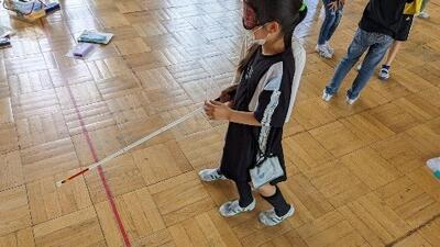 長さの学習で巻き尺やタブレットの計測アプリを使って、1mより長いものの長さを測りました。友達と協力してめもりを読んで、プリントに記録しました。自分たちの身近にあるものがおよそ何mなのか調べることができました。