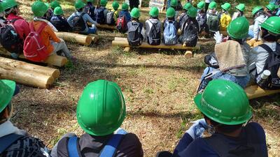 森林の中にある丸太のベンチに座り、森林の働きや間伐の意味などをお教えいただきました。