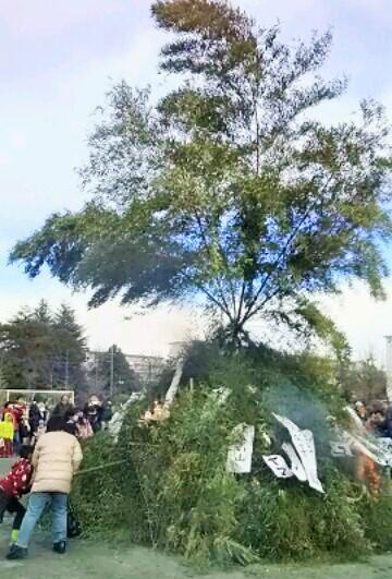 青空に粉雪が舞う中,毎年恒例の青少協主催による「どんど焼き」が行われました。