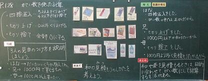 概数を使って、目的に合わせて「四捨五入」「切り上げ」「切り捨て」を使いわける方法について考えました。子供たちはそれぞれのやり方の理由を自分の言葉で説明していました。