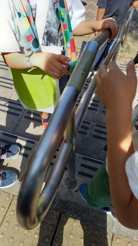 さっそくスロープにある手すりに付いた点字を発見しました。