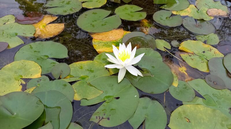 観察池に蓮の花が咲いていることがあります。この日は2輪、濃いピンクと白の花を見ることができました。全校朝会での校長の話は「古代蓮」についてでした。
