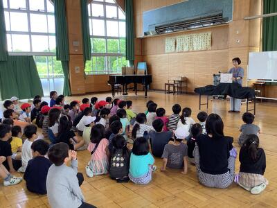 中休みにホールにてMoMの会の皆さんによる読み聞かせがありました。みんな、よーく聞き入っていました。