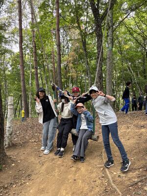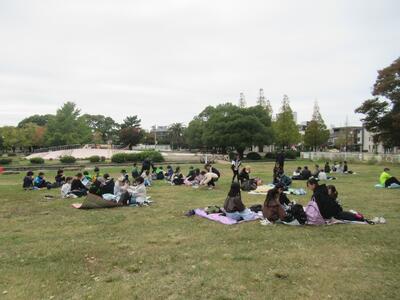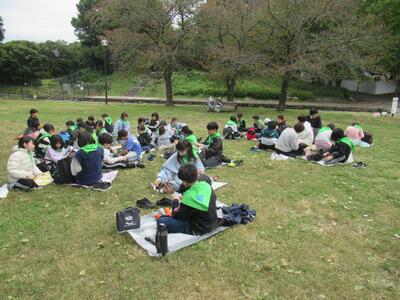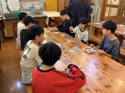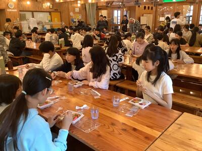 昼食です。おにぎり弁当を食べました。少し肌寒いですが、午後も楽しいアクティビティが盛りだくさんです。