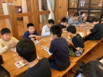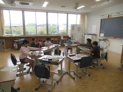 1・2年生 「野外給食」でした。班ごとに集まって教室で食べました。