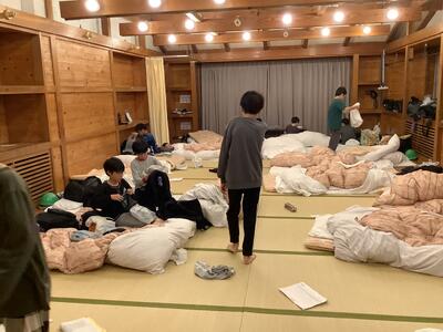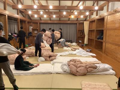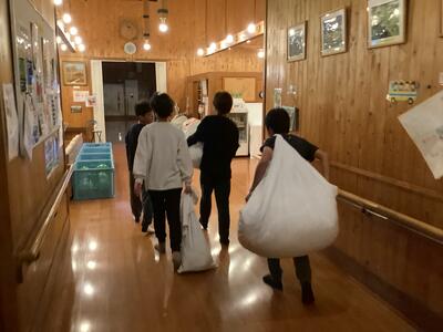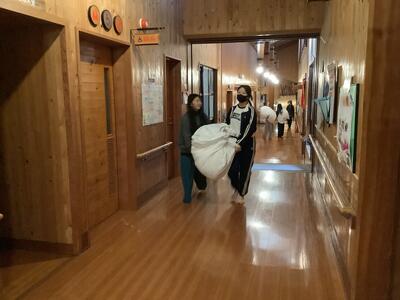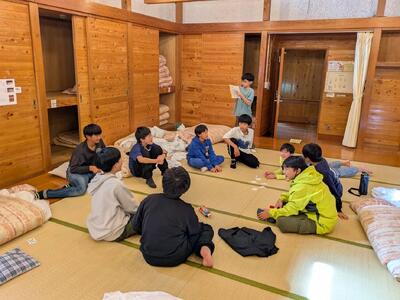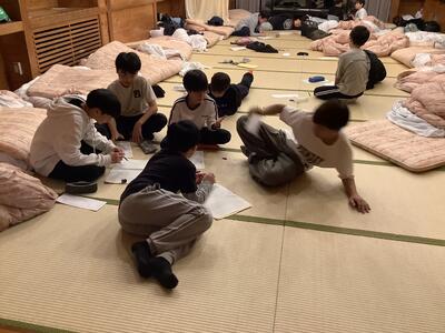 おはようございます。3日目の朝です。早く目覚めた人も6時半になるまでは布団の中で静かに過ごしていました。検温し、布団をたたみ、朝の会を行いました。