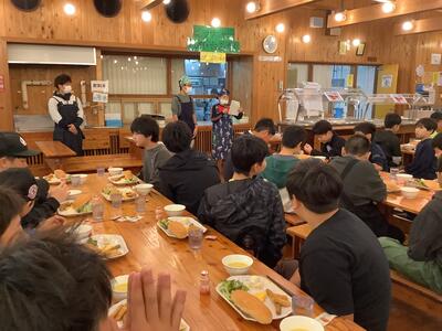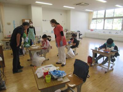 今日は、給食センターの方々が訪問され、給食のことについていろいろと教えてくださいました。