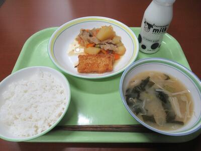給食 豚丼、のっぺい汁、ぶどうゼリー、牛乳 でした。