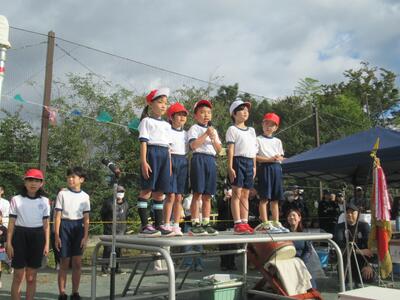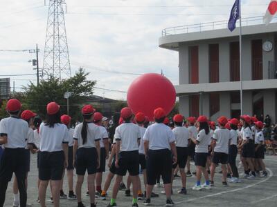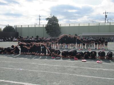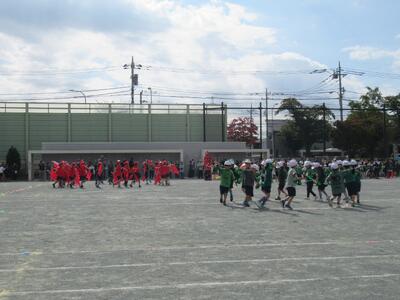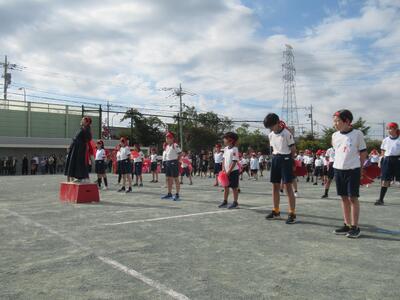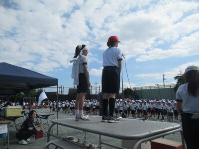 全校練習 週末の運動会本番に向けて開会式、応援合戦の練習を行いました。