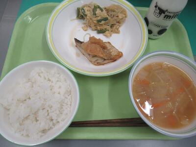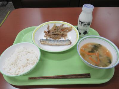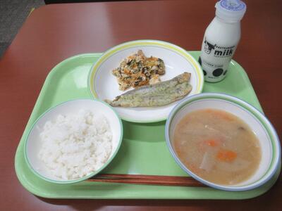 給食 ごはん、もずくの味噌汁、みなみかごかます(銀さわら)のさざれ焼き、野菜のおかか炒め、牛乳 でした。