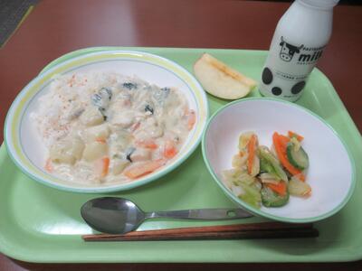 給食 秋野菜カレーライス、海藻サラダ、みかん、牛乳 でした。