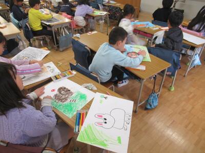2年生、絵の具を使って色を塗っています。
