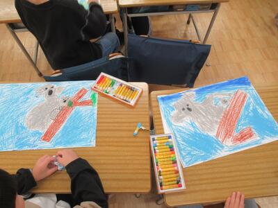 3年生 図工では「にじいろモンスター」を制作中です。スクラッチという技法を使ってモンスターを描いています。