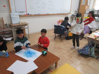 にじ組 算数では三角形や四角形の色紙を使って、形づくりを行いました。