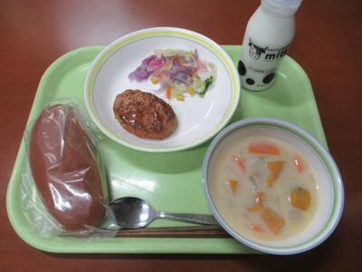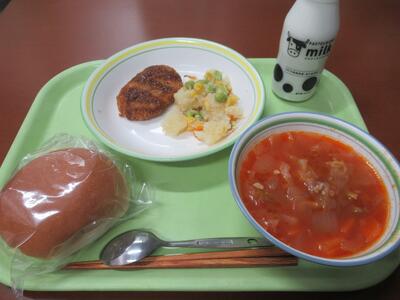 給食 イギリスパン、野菜のスープ、クリスピーチキン、根菜のラタテュイユ、牛乳 でした。