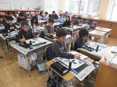 4年生 毛筆書写で「白馬」と書きました。