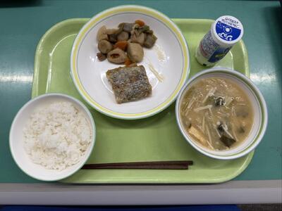 給食 ごはん、根菜のごま汁、きびなごフライ、ひじきの煮物、牛乳 でした。