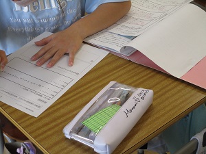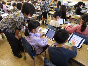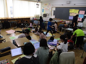 1年生の国語「じどう車ずかんをつくろう」の学習です。じどう車の「しごと」と「つくり」で表されている文に注目し、自分の経験からバスの「しごと」と「つくり」を書き込んでいく内容でした。難しい内容ですが、どの子もきちんとやることを理解し、バスの様々な「つくり」を見つけていました。見つけて書き込んだワークシートは、写真を撮りロイロノートで送ります。それを大きく映し出し、友達のいいところを見つけました。タブレットの操作も完璧です。学習の幅が大きく広がったのを感じました。1年1組さん、がんばりました!