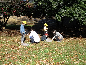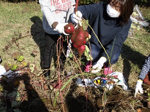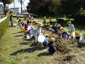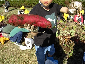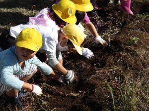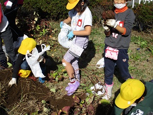今日は小春日和を思わせるほど暖かくなり、さつまいも掘りには絶好の天気になりました。担任の先生の説明の後、とにかくいもを見つけようと、子供たちの必死に土を掘る姿がかわいらしかったです。中には大きな大きなさつまいもを掘り起こした子供も!今年も大豊作だったようです。道行くお年寄りが、黄色い帽子をかぶった1年生が並んでいもを掘る姿に「すてきな景色だなあ。」と声をかけてくださいました。最初の2枚の写真は、にじ組5年生の算数の授業の様子です。「速さ」の学習で、時間を求める公式を見付ける学習でした。「時間=道のり÷速さ」で求められます。なかなか高度な内容ですが、子供たちは数直線を手掛かりに答えを導き出すことができていました。とっても集中してがんばっていました!
