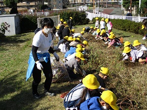 1年生が並木公園に凧あげに出かけました。とても冷たい風が吹いていたのですが、子供たちは寒さよりも凧をあげるのに一生懸命で、元気いっぱいに走り回っていました。凧に描いた子供たちの絵がかわいらしく、それが空高く上がっているのは、何ともいえずいいものです。ご家庭に持ち帰ったら、ぜひご家庭でもあげてみてください。写真を撮りに行った私は、からまる糸をほどくので大変でした!皆さんがあげるときは、隣とくっつかないように気を付けましょう。