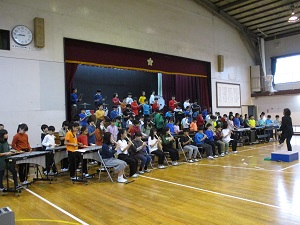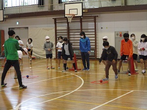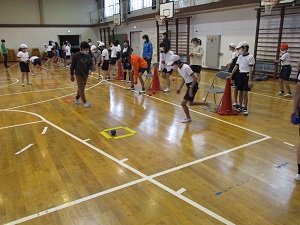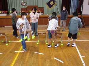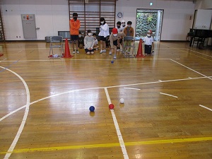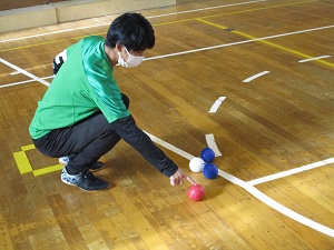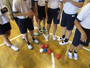 5年生が多摩市障害者スポーツ教室に参加しました。毎年来ていただいていますが、今日の種目はボッチャです。誰でも楽しめる競技です。ルールも簡単で、ジャックボール(白い球)に自分のチームの球を一番近づけることができたチームに点が入ります。子供たちはジャックボールに少しでも近づけようと、投げ方を工夫したり、力加減を調整したりしていました。障害のある方も実施できる競技なので、手だけでなく足で蹴るやり方にも挑戦しました。このような体験を通して、障害のある方への思いや大変さにも目を向けてほしいと思います。